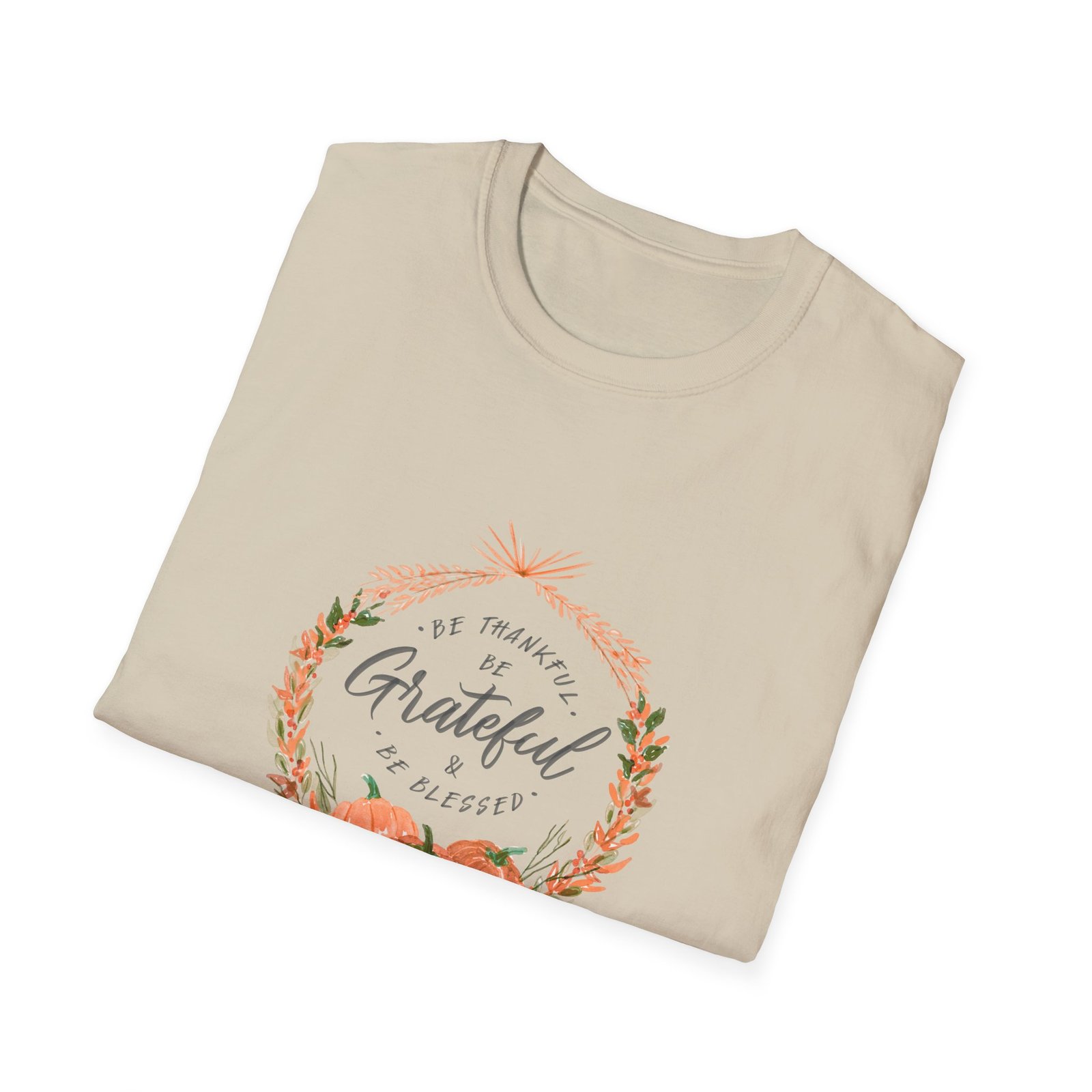 Embrace the heart of the season with our Be Thankful, Be Grateful & Be Blessed T-shirt. Featuring a beautifully hand-painted wreath of autumn leaves and soft watercolor pumpkins, this design captures the warmth and serenity of fall. The gentle, earthy tones and elegant lettering remind you to pause, reflect, and appreciate the beauty in everyday moments — a perfect expression of the Thanksgiving spirit.