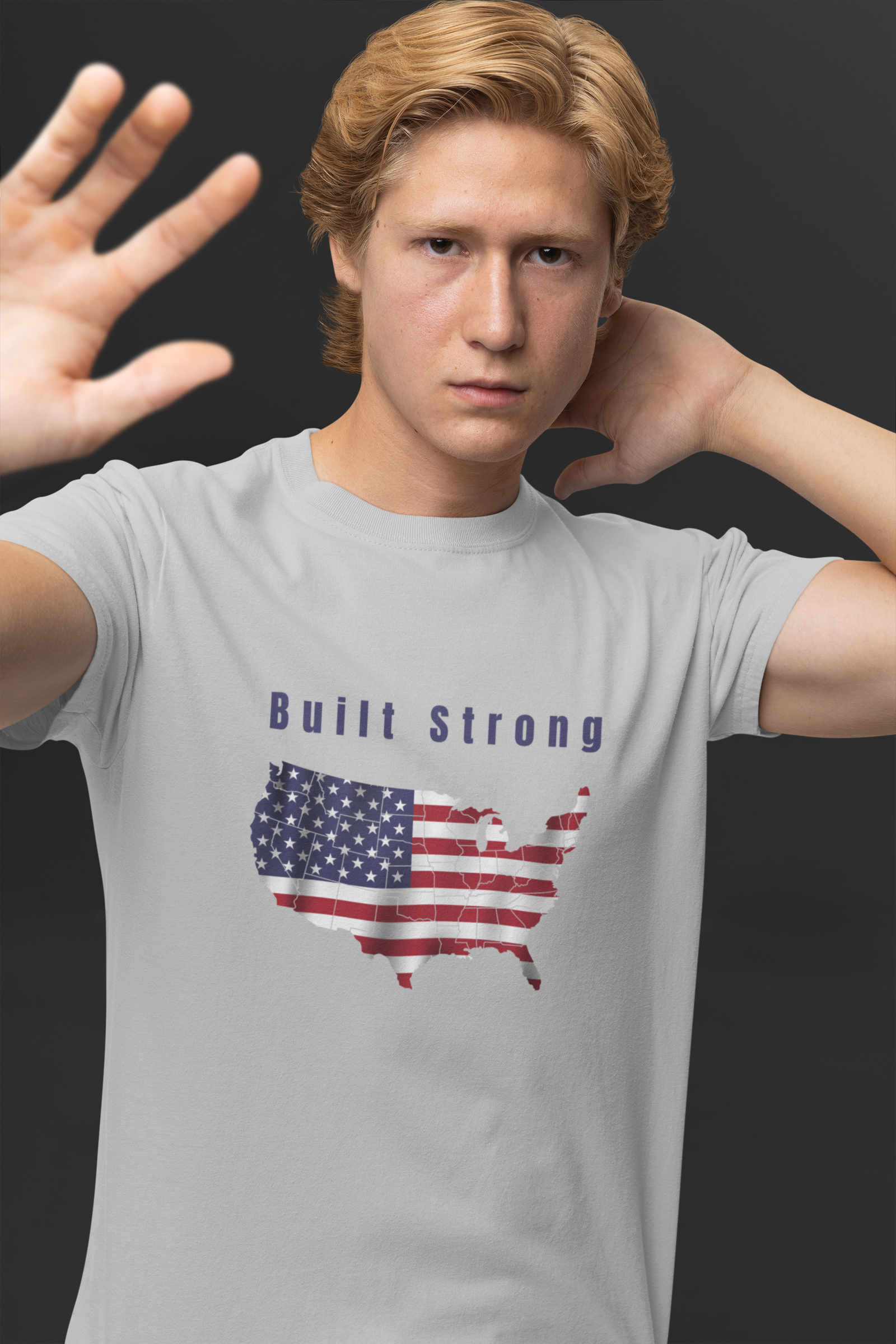 The “Built Strong” tee features a bold graphic of the United States map paired with a powerful message that speaks to the resilience, grit, and determination that define the American spirit. It’s a design that honors the strength found in every corner of the nation, from coast to coast.