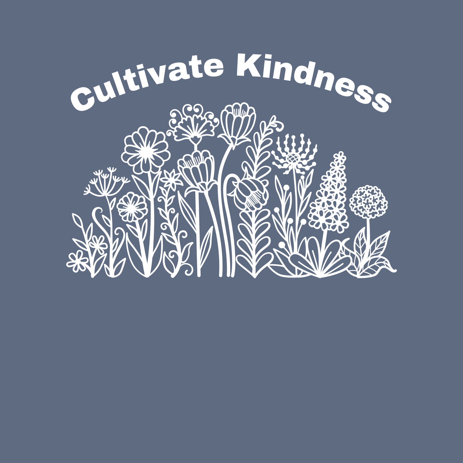 The Cultivate Kindness T-shirt features a beautiful row of fully bloomed flowers, each unique and vibrant, symbolizing growth, warmth, and positivity. Above the floral display, the uplifting phrase “Cultivate Kindness” serves as a gentle reminder to spread compassion and goodness in everyday life.