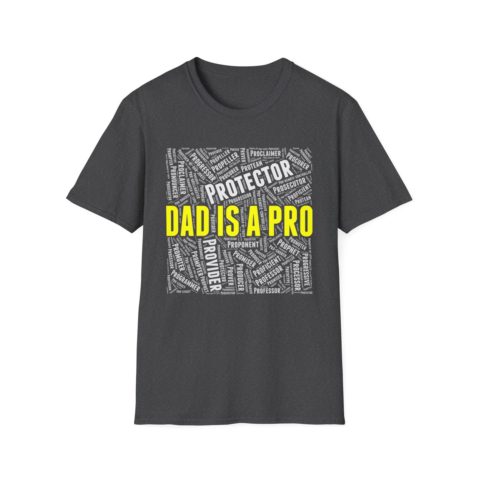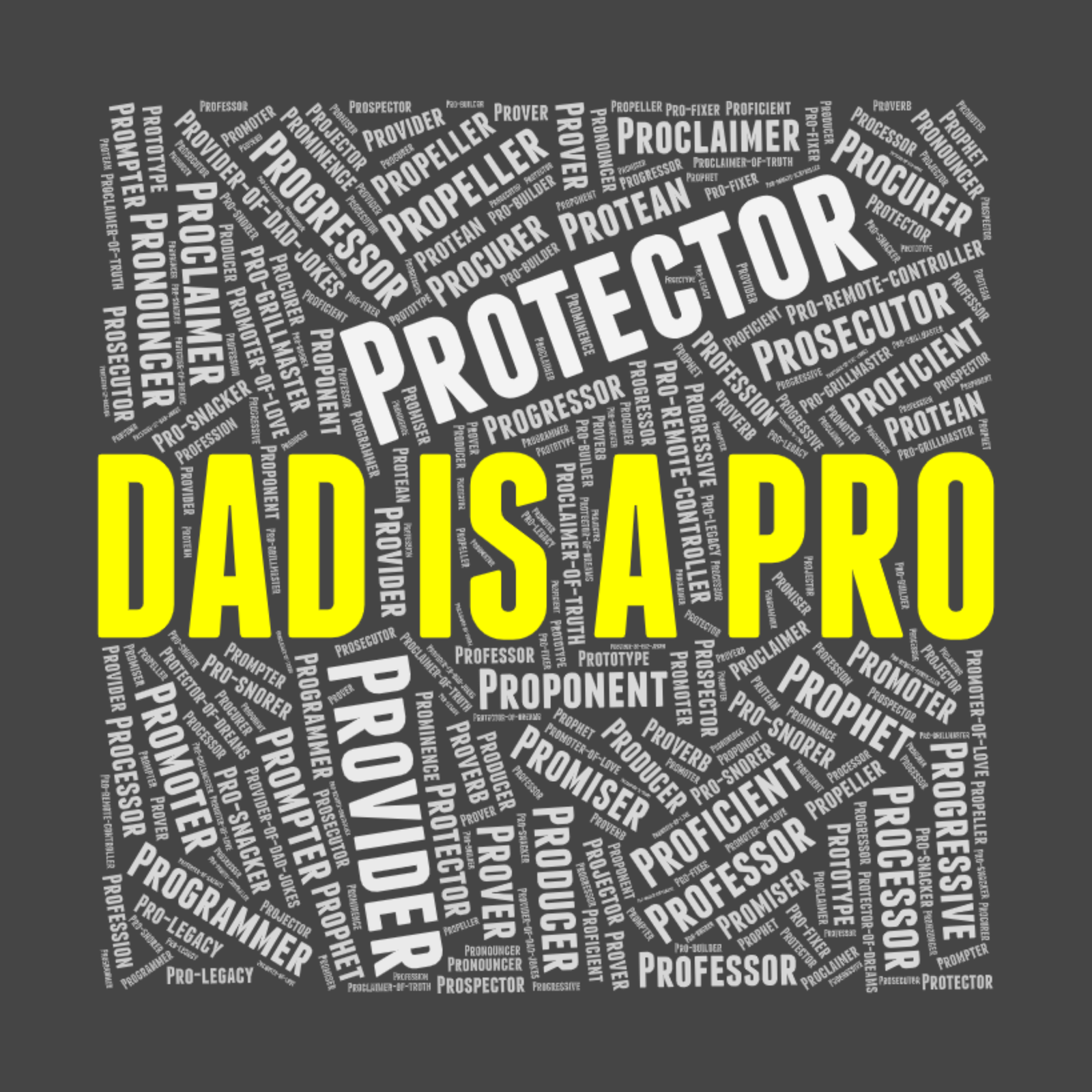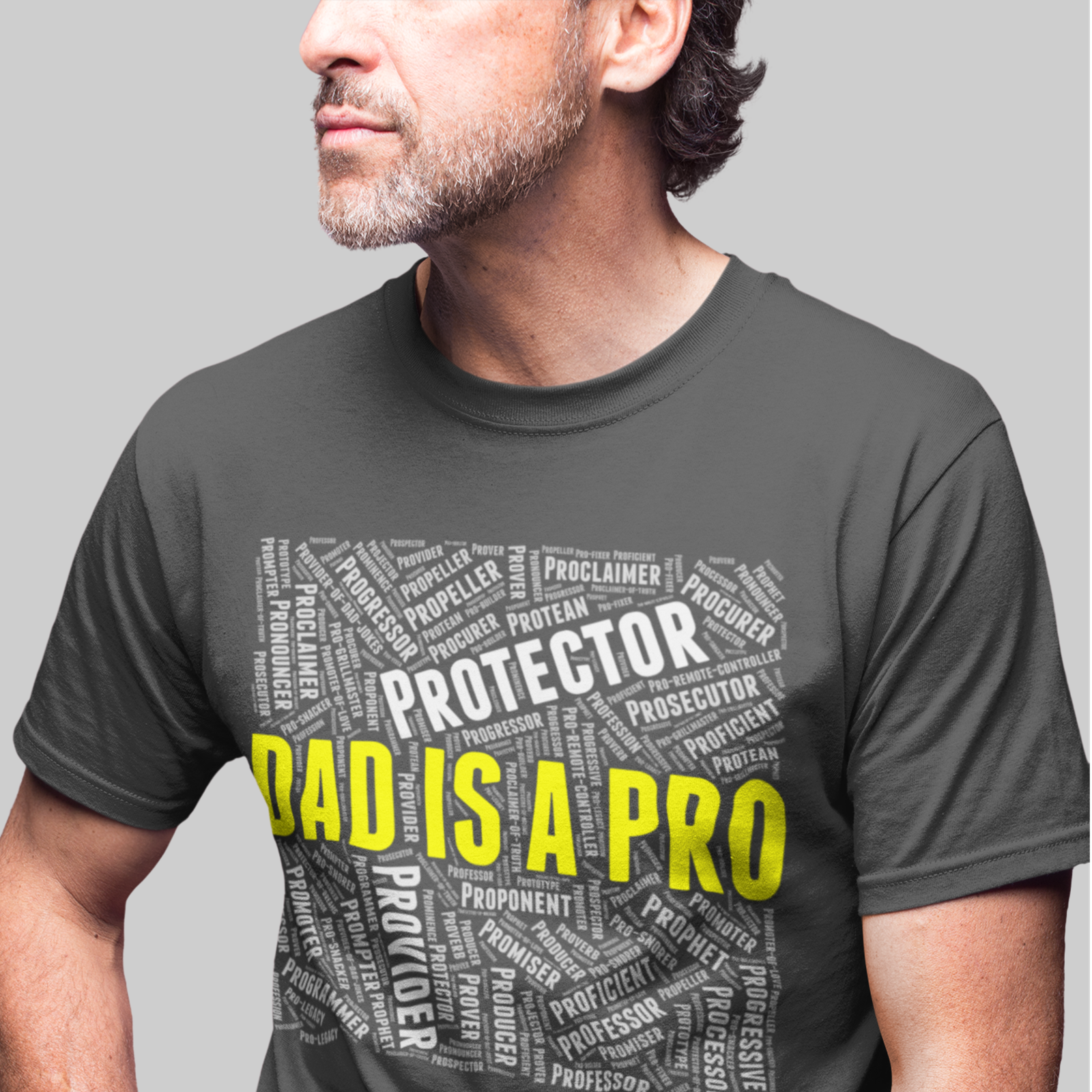 Celebrate all the things Dad excels at with this creative and bold Dad Is A Pro T-shirt. This design features the main phrase “Dad is a Pro” at the center, surrounded by a dynamic mix of words that begin with “pro”—like protector, provider, problem-solver, and more. It’s a fun, visually engaging tribute to everything that makes him awesome.