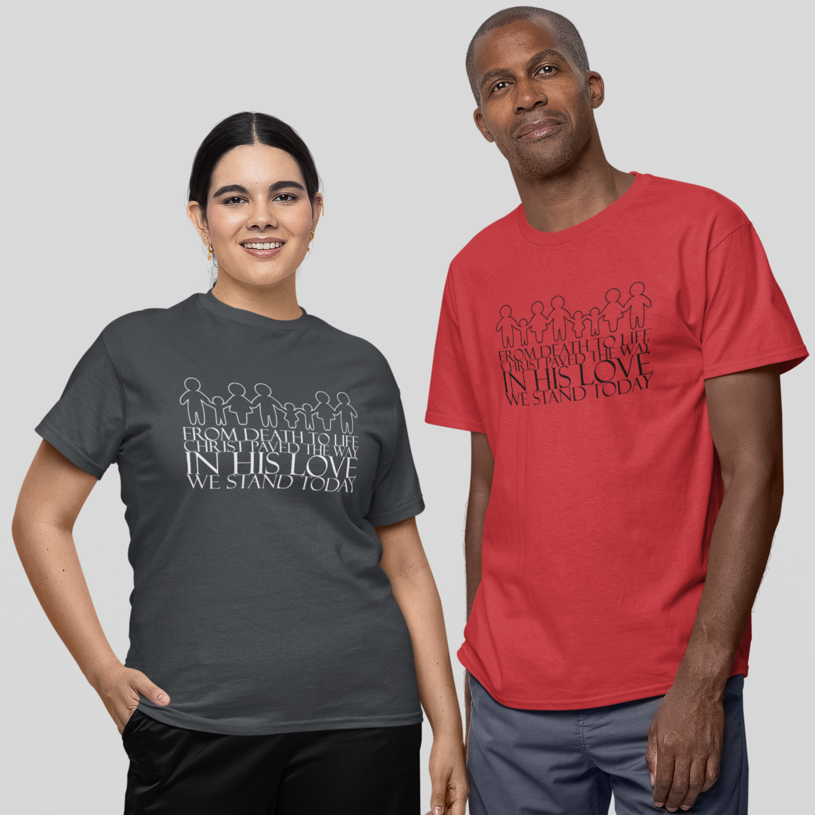 The In His Love, We Stand Today T-shirt is a meaningful and faith-filled design that beautifully represents unity and renewal. It features the outline of women, men, and children holding hands, symbolizing togetherness and the strength of faith. Accompanied by the powerful quote “From death to life, Christ paved the way. In His love, we stand today”, this T-shirt serves as a reminder of Christ’s sacrifice and the hope found in His love.