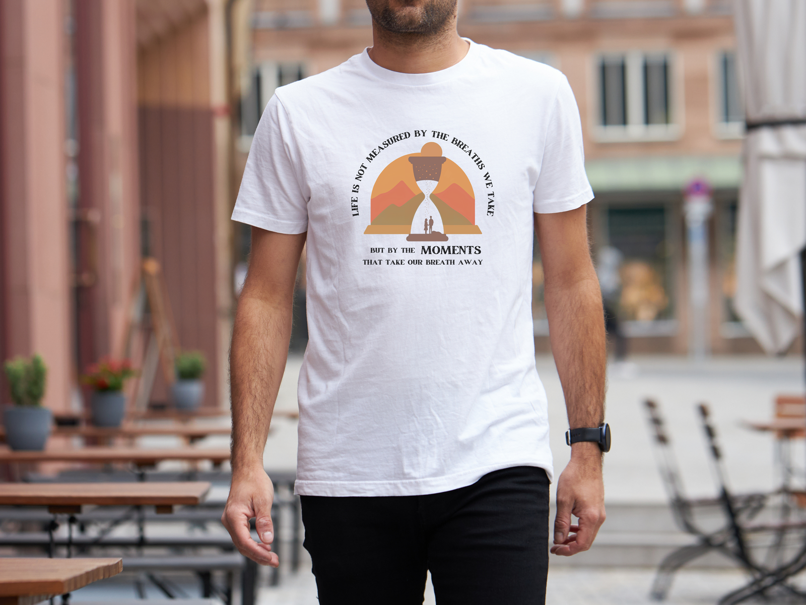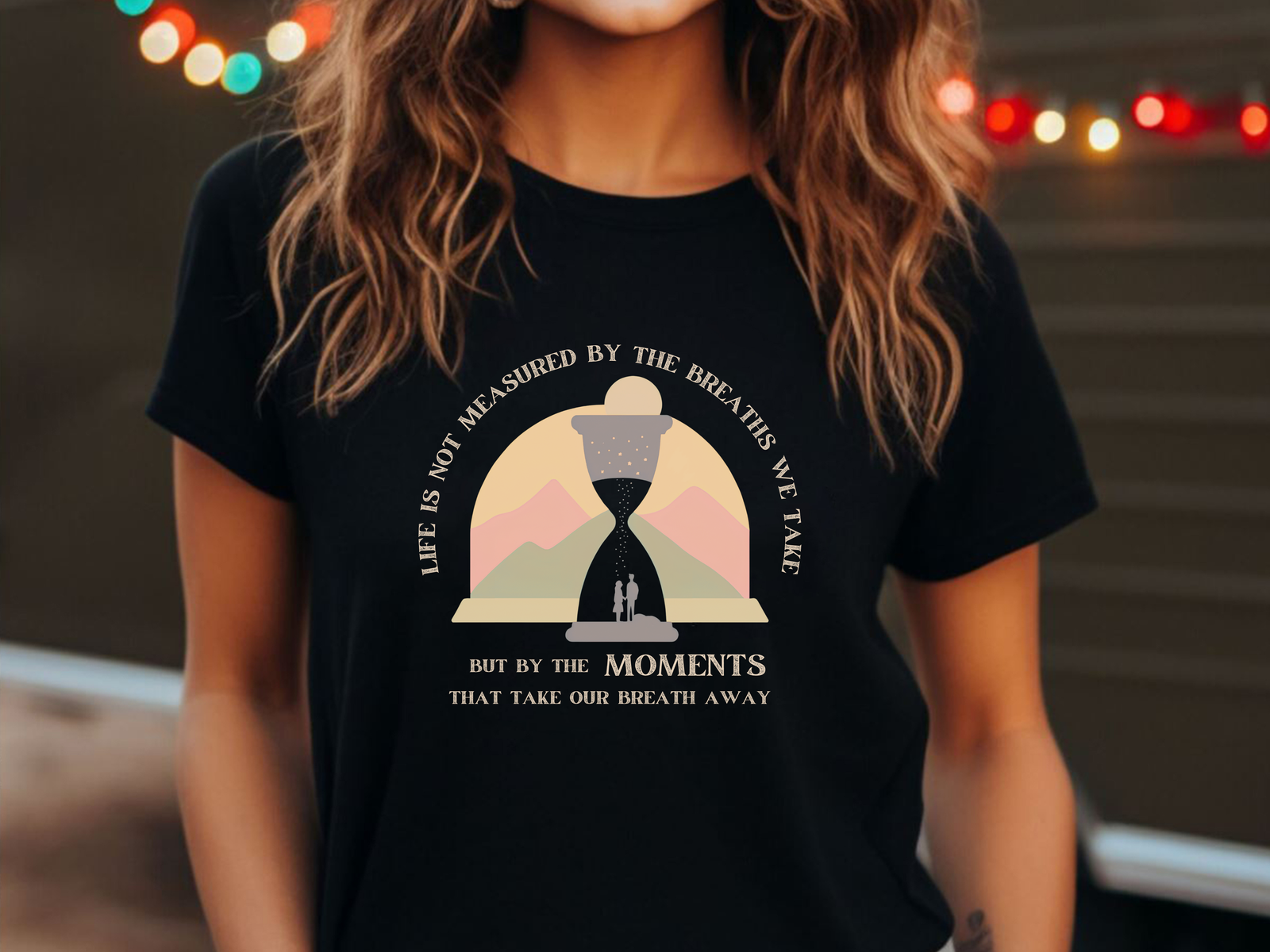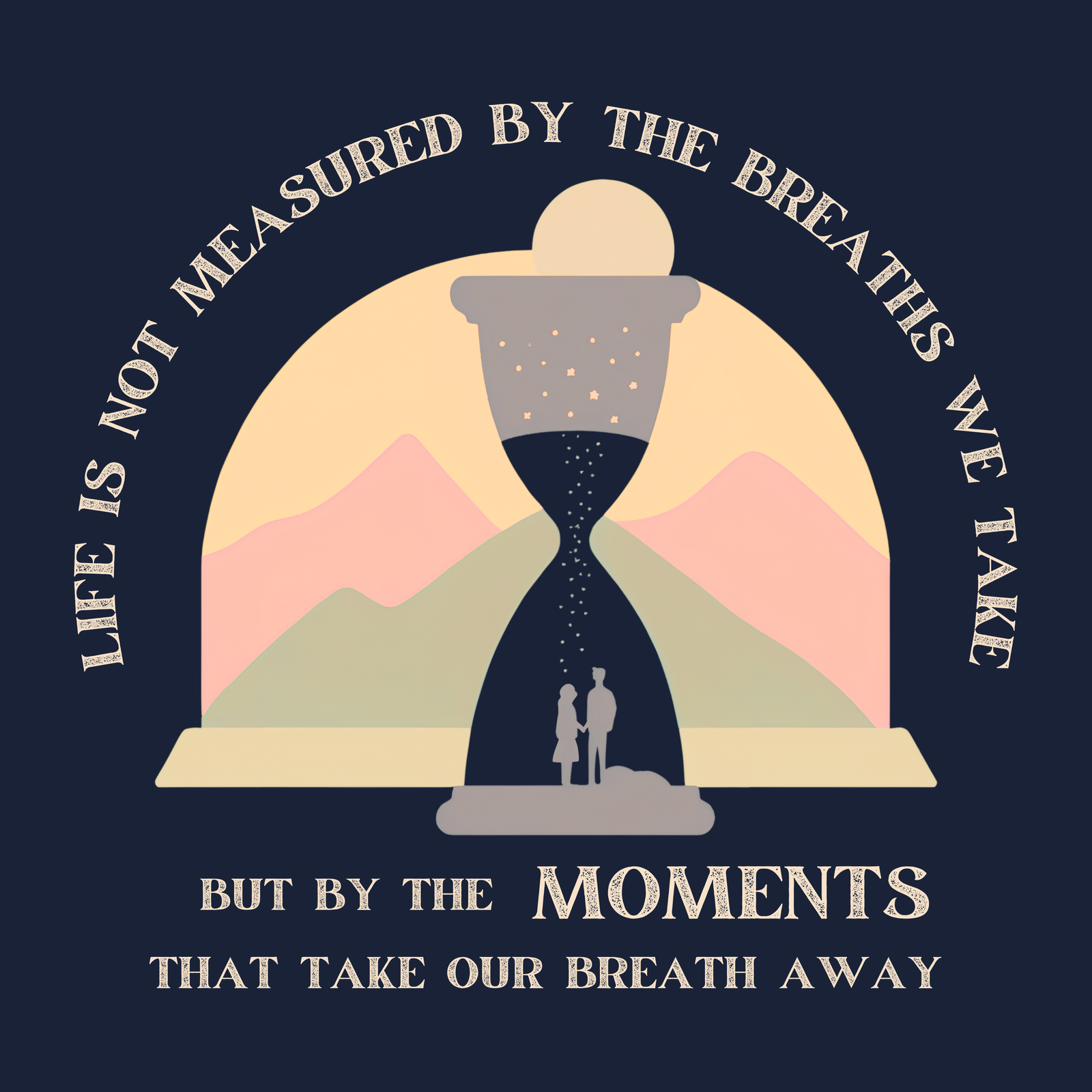 The Life Is Not Measured By The Breaths We Take But By The Moments That Take Our Breath Away T-shirt offers a beautifully reflective message. The design features the thought-provoking text paired with an image of an hourglass and a couple, symbolizing the precious moments in life that truly define us. Made from soft, high-quality cotton, it ensures a comfortable and breathable fit.