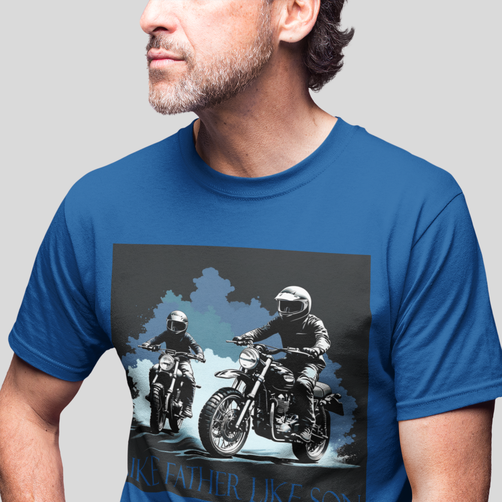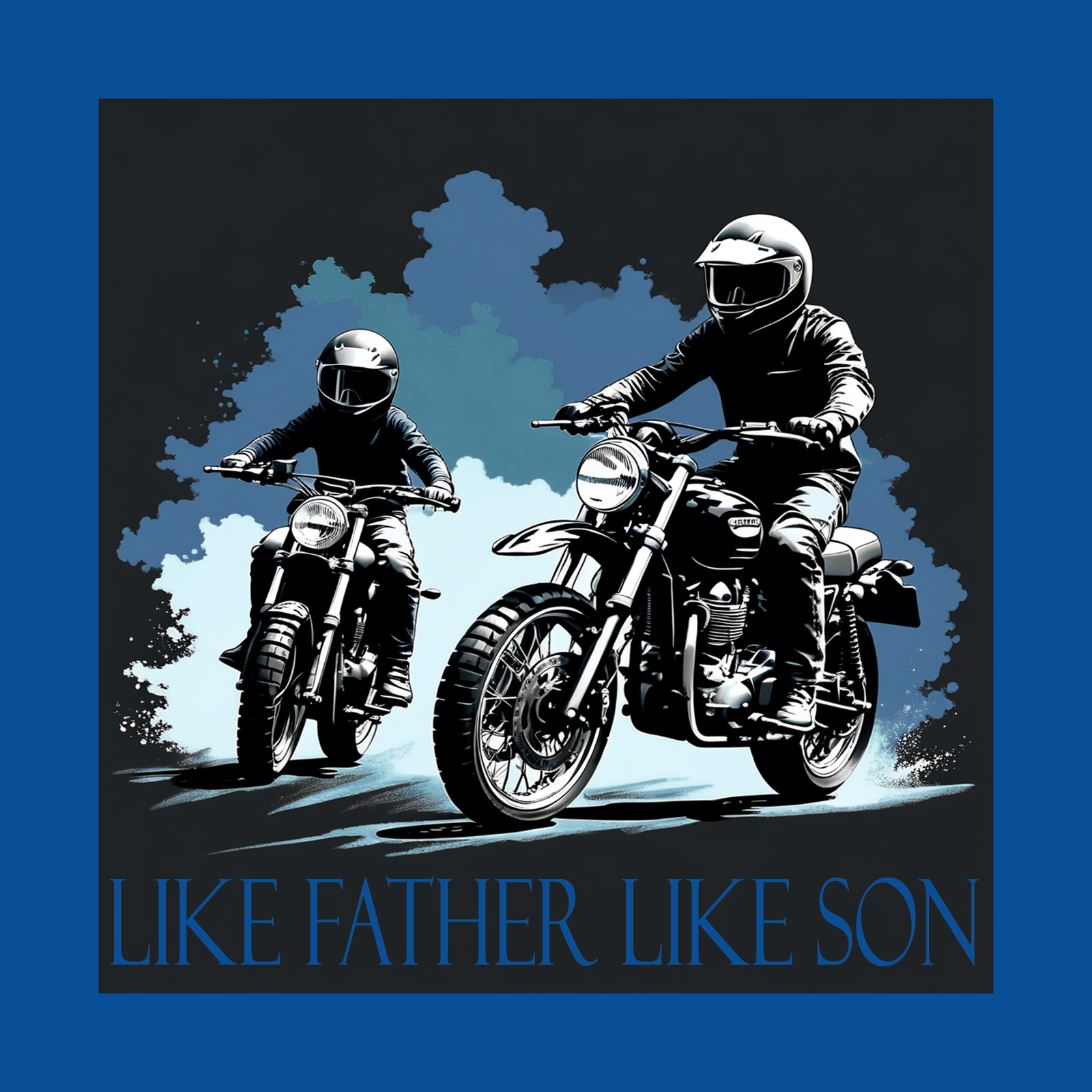 The Like Father Like Son T-Shirt features a dynamic graphic of a dad and his son riding on motorcycles, side by side, with a colorful cloud of smoke trailing behind them. The bold text “Like Father Like Son” anchors the design, highlighting their shared love for the open road and the unbreakable bond between them.