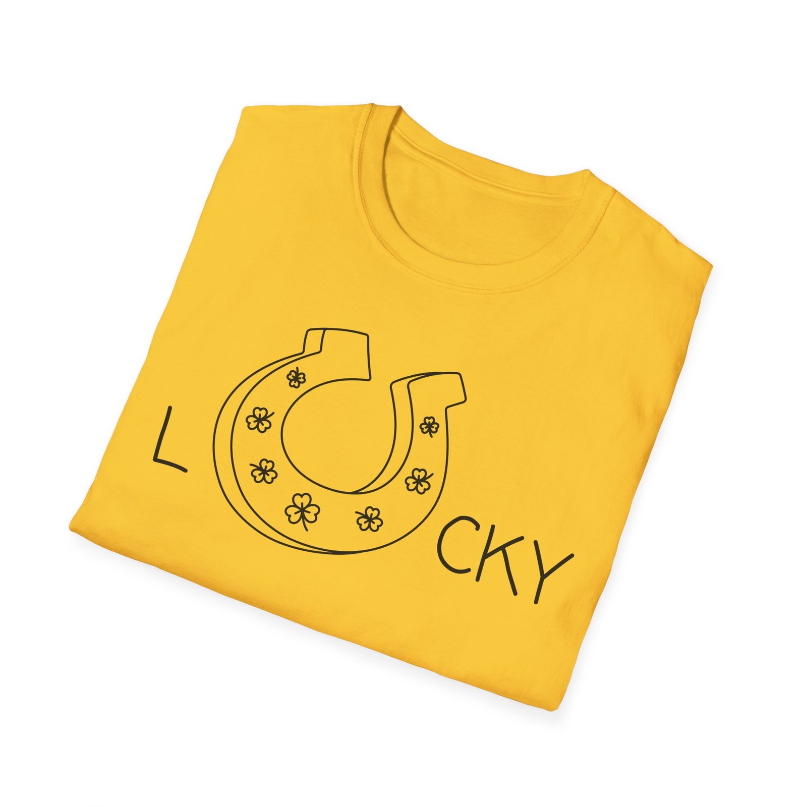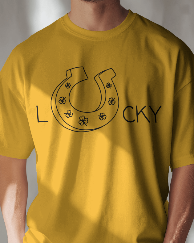 This T-shirt features a bold and festive design with the word “Lucky,” where the “U” is creatively shaped like a horseshoe and accented with three-leaf clovers. The combination of classic lucky symbols makes this shirt a perfect choice for celebrating St. Patrick’s Day or embracing a little extra good fortune. Made from a soft, breathable cotton blend, it offers both comfort and style for any casual occasion.