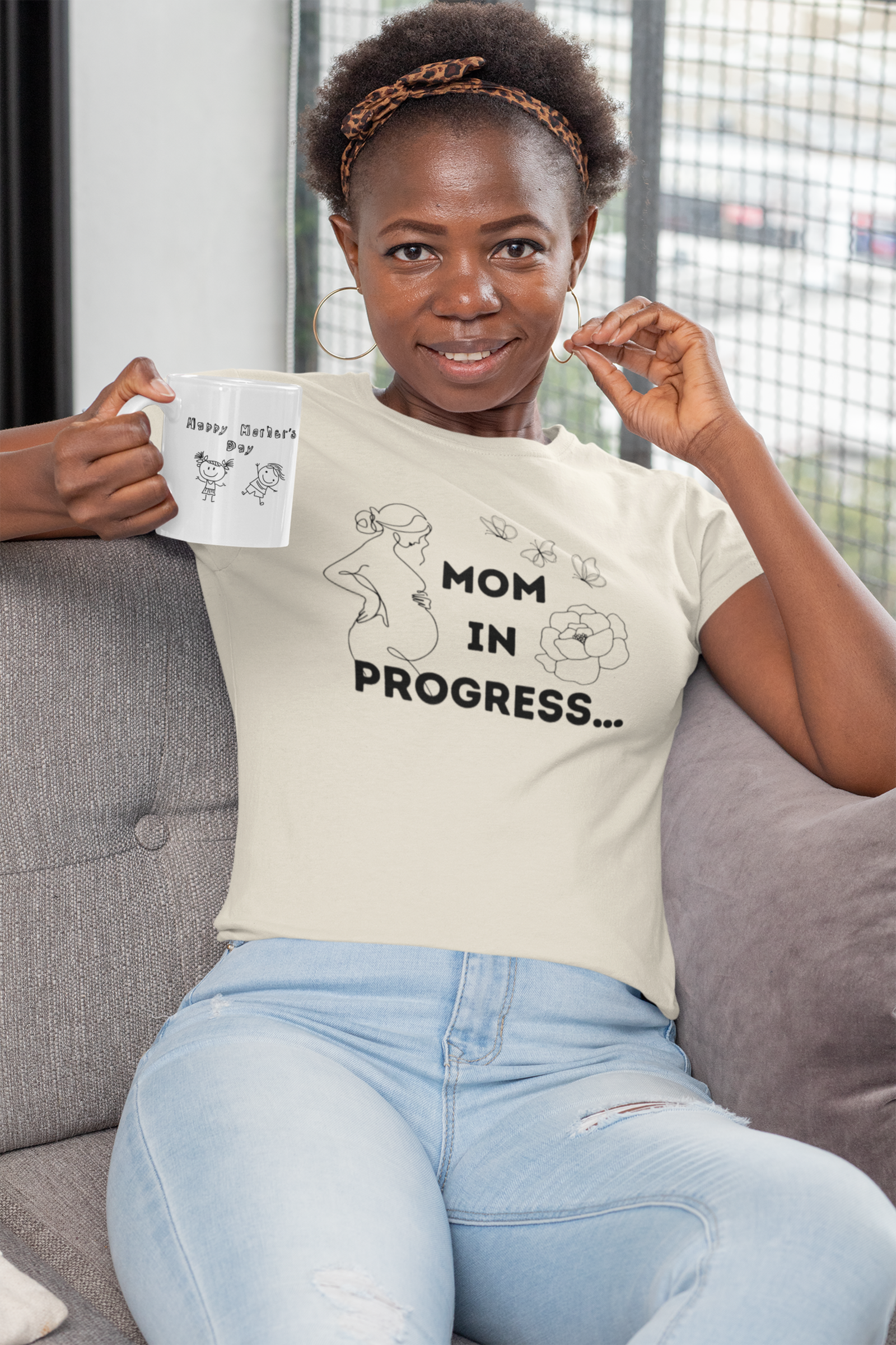 The Mom In Progress T-shirt features a graceful line art illustration of a pregnant woman surrounded by fluttering butterflies, paired with the phrase “Mom in Progress.” The design is simple yet meaningful, capturing the beauty and transformation of motherhood in an elegant way. Made with comfortable, breathable fabric, this tee is ideal for expecting moms who want to celebrate their journey with a touch of charm.