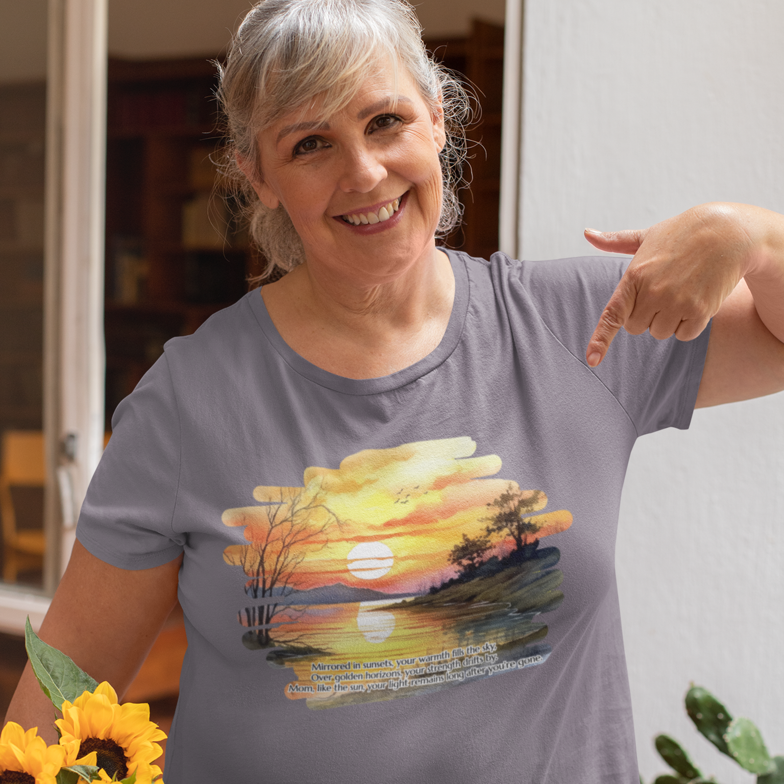 The Mom’s Light T-shirt features a serene sunset graphic paired with a heartfelt poem about a mother’s light. The warm tones of the sunset create a calming and uplifting backdrop for the words that honor a mom’s unwavering love, guidance, and strength. Printed on soft, high-quality fabric, the tee offers a relaxed, comfortable fit that’s perfect for daily wear or special occasions.