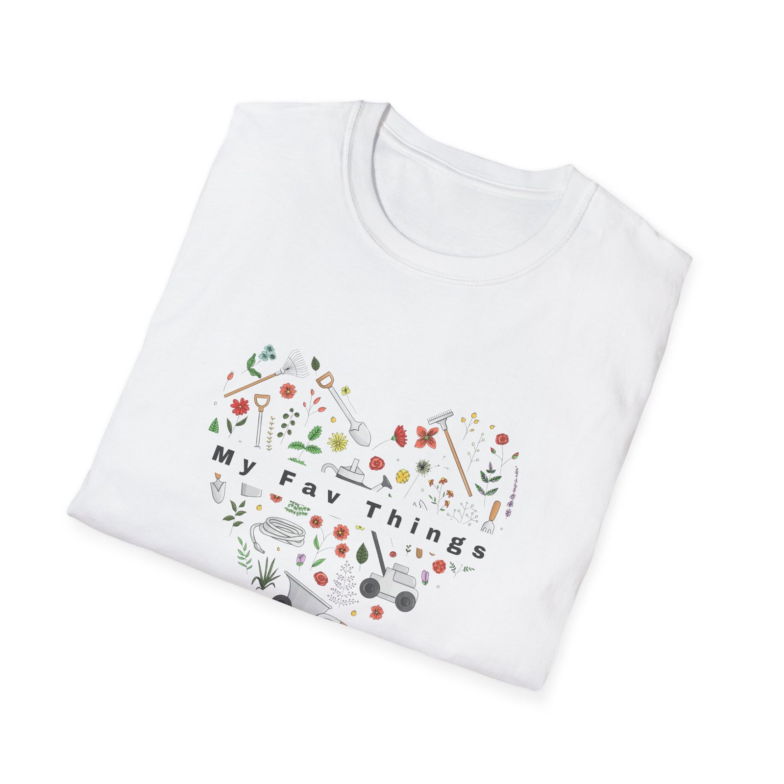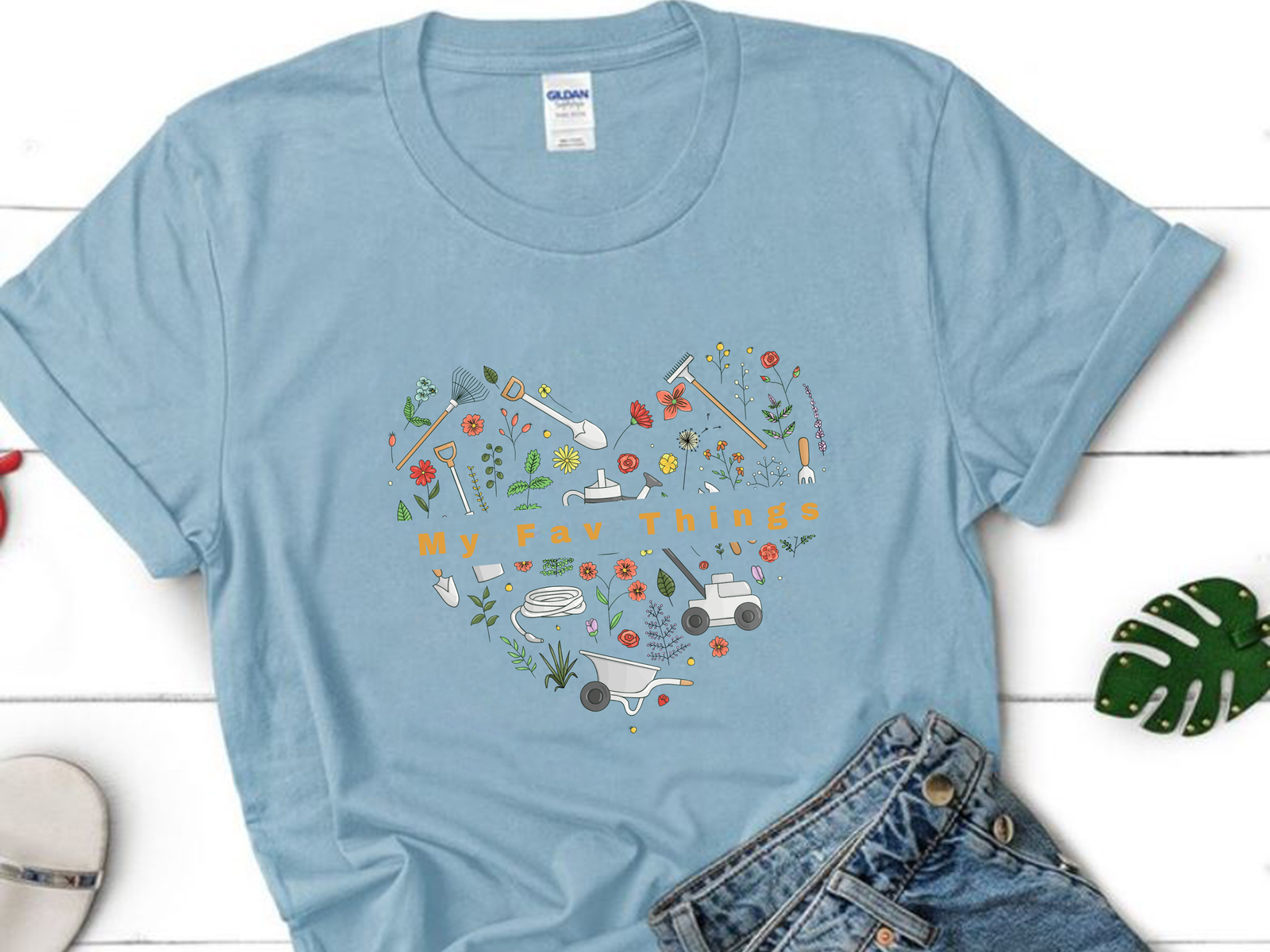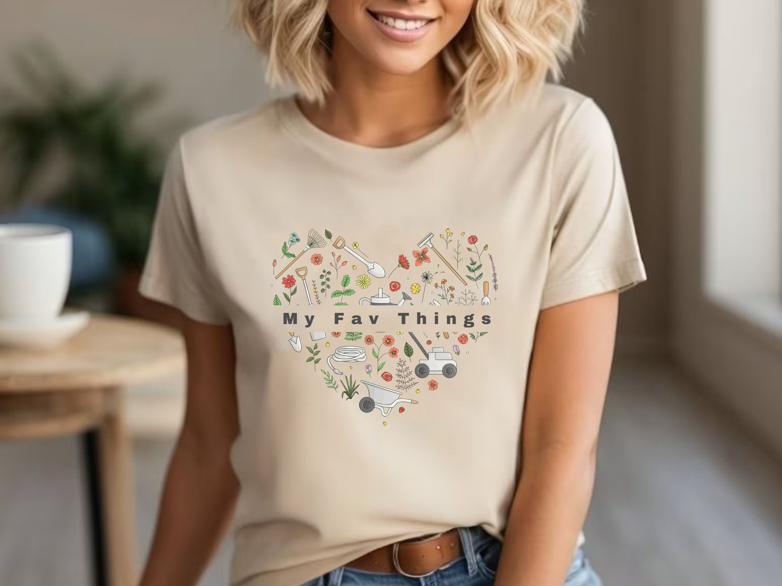 Featuring a unique heart made up of garden tools, this T-shirt captures the essence of gardening with a creative twist. The phrase “My Fav Things” is displayed alongside the graphic, making it an ideal choice for those who love spending time in nature and tending to their gardens. Made from a soft, high-quality cotton blend, it offers comfort and breathability for everyday wear.