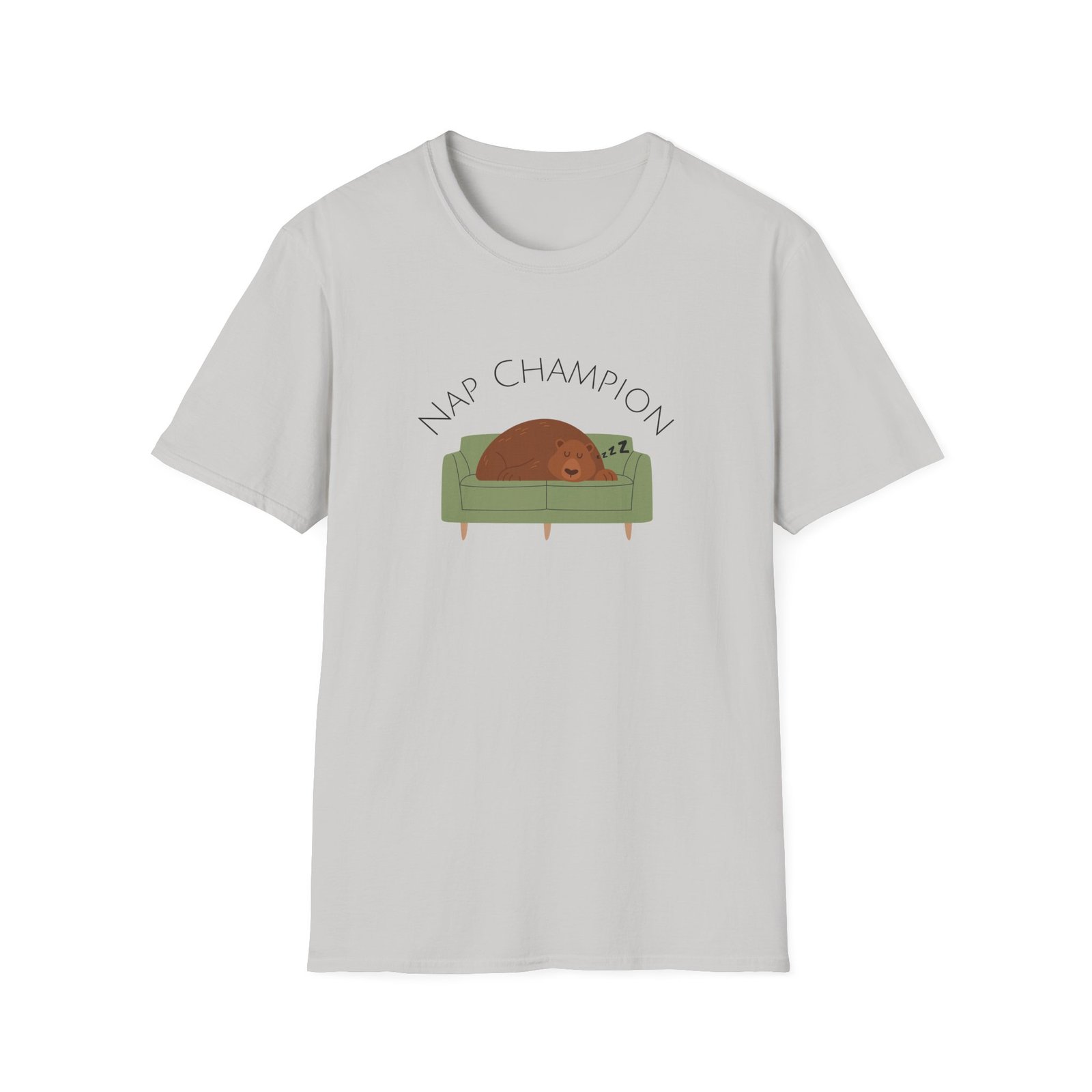 The Nap Champion T-Shirt features a charming graphic of a brown bear peacefully snoozing on a cozy green couch, with the words “Nap Champion” displayed proudly above. This lighthearted design captures the art of relaxation in a fun and playful way, perfect for the dad who takes his rest seriously—or at least tries to.