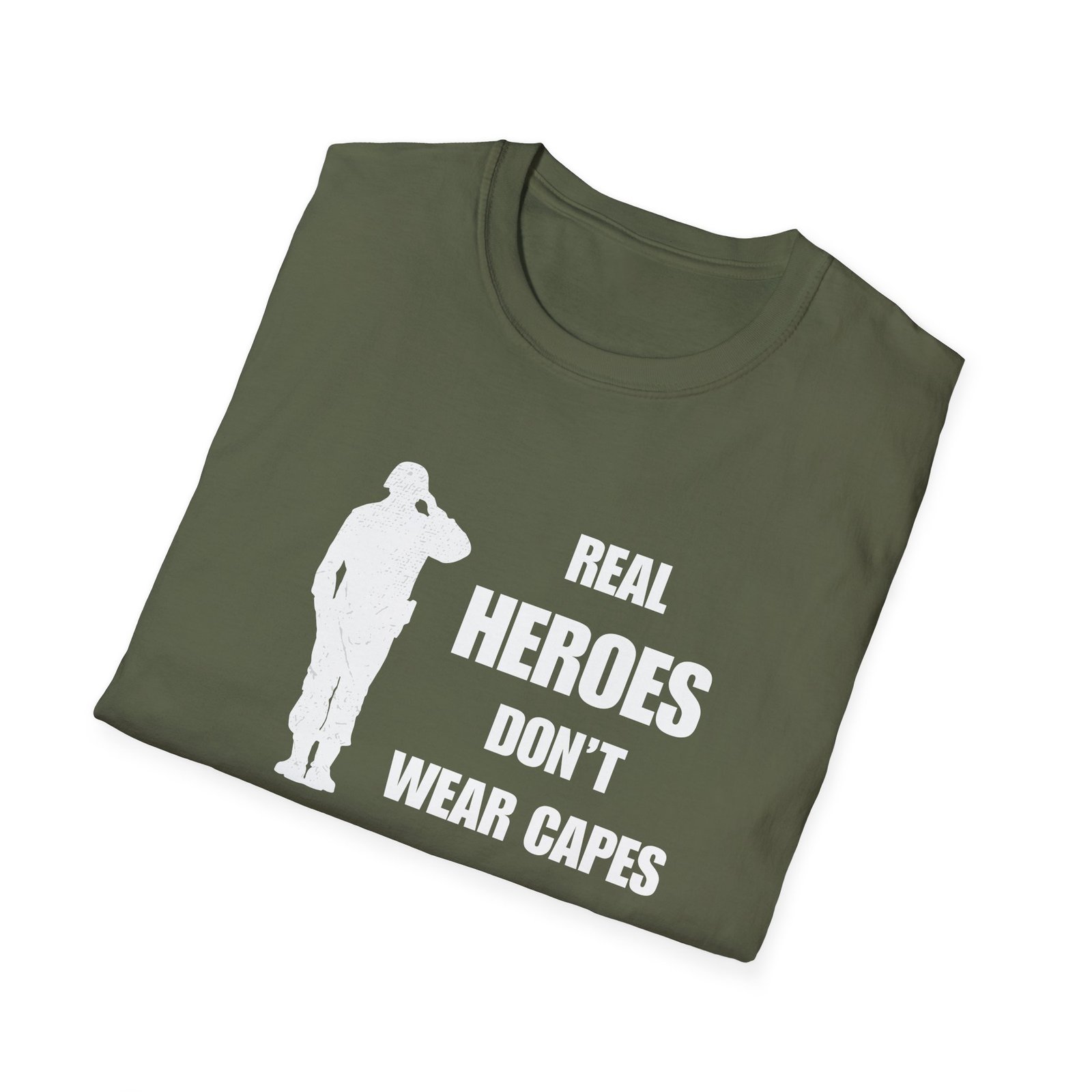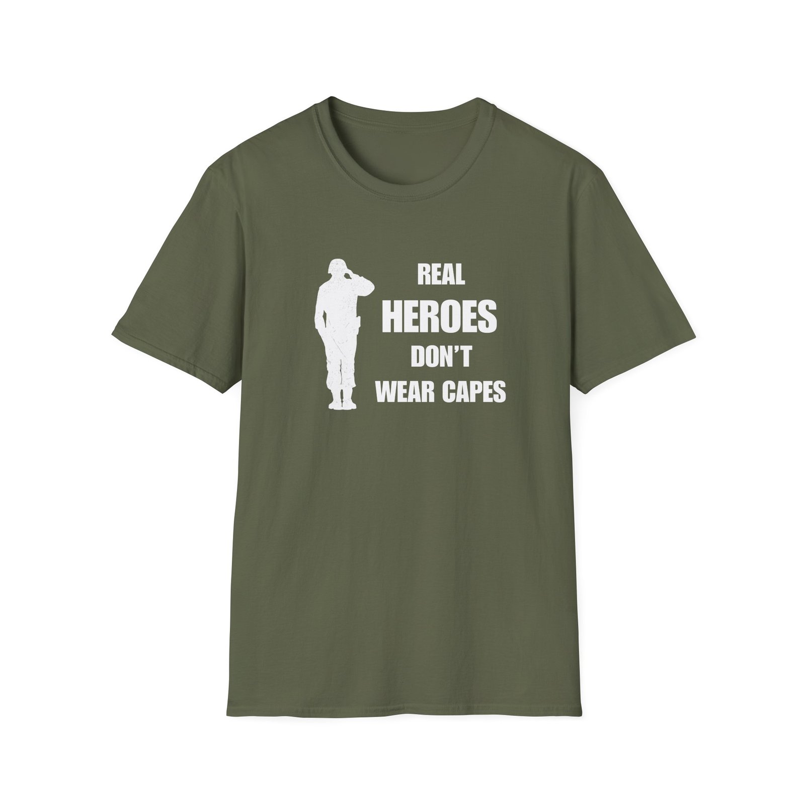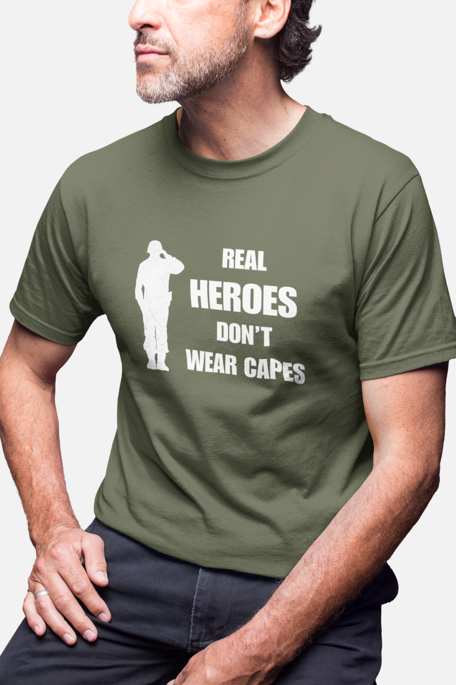 The “Real Heroes Don’t Wear Capes” tee features a powerful image of a soldier, honoring the courage and sacrifice of those who serve. This design is a reminder that true bravery doesn’t need a costume. It represents real-life strength, loyalty, and the quiet heroism found in every service member.