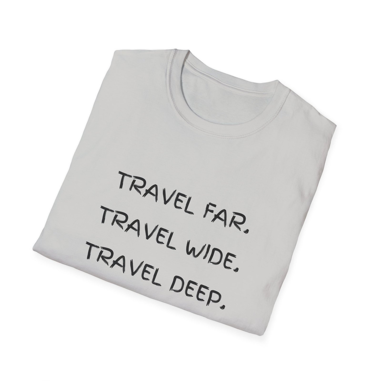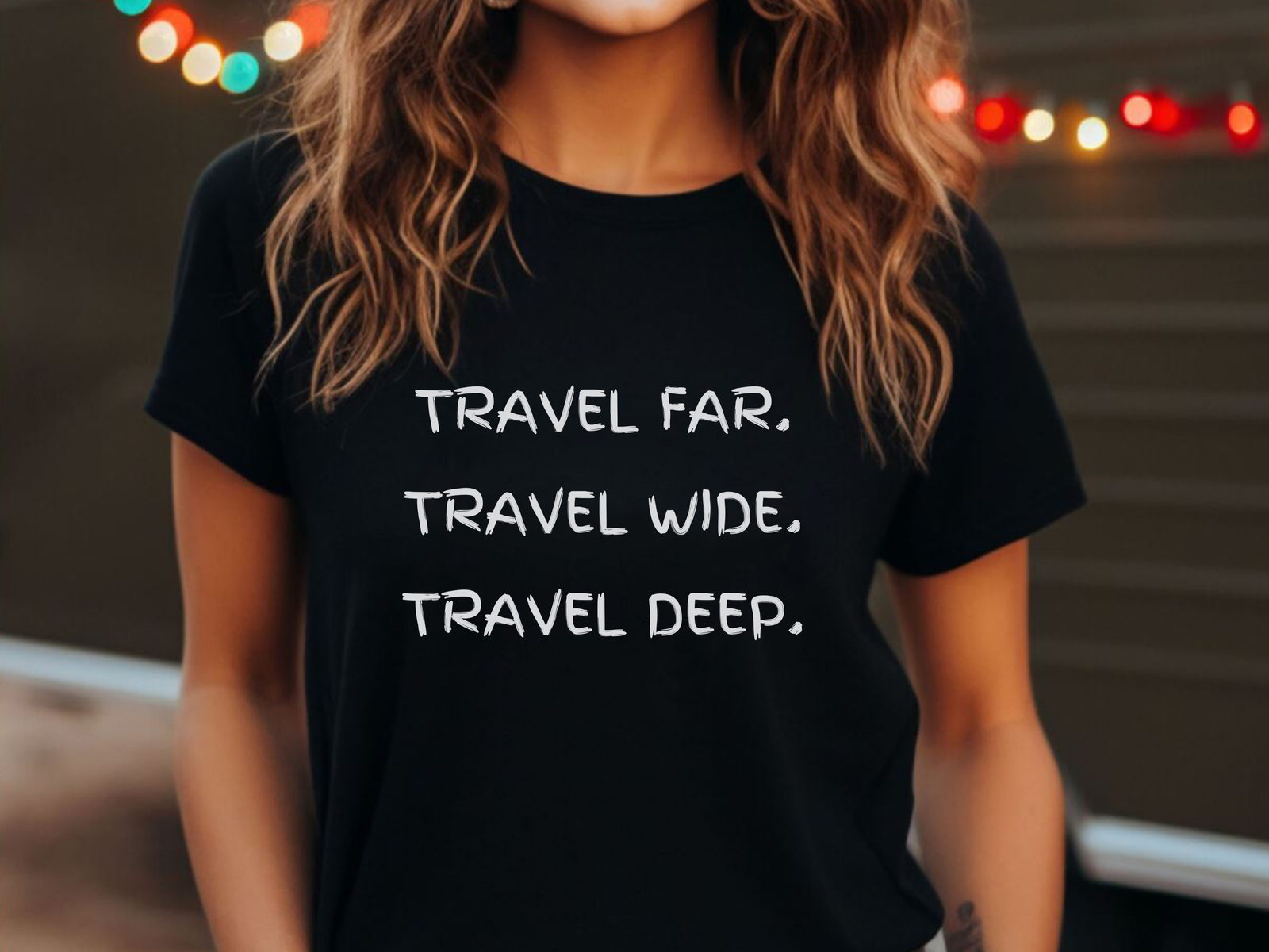 Embrace your wanderlust with the Travel Far, Travel Wide, Travel Deep T-shirt. Perfect for those who believe that travel broadens the mind and enriches life, this shirt is a reminder to seek new experiences and adventures. Add it to your wardrobe today and wear it as a badge of your passion for exploration.