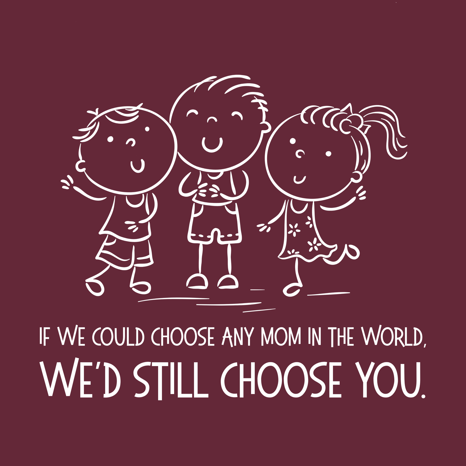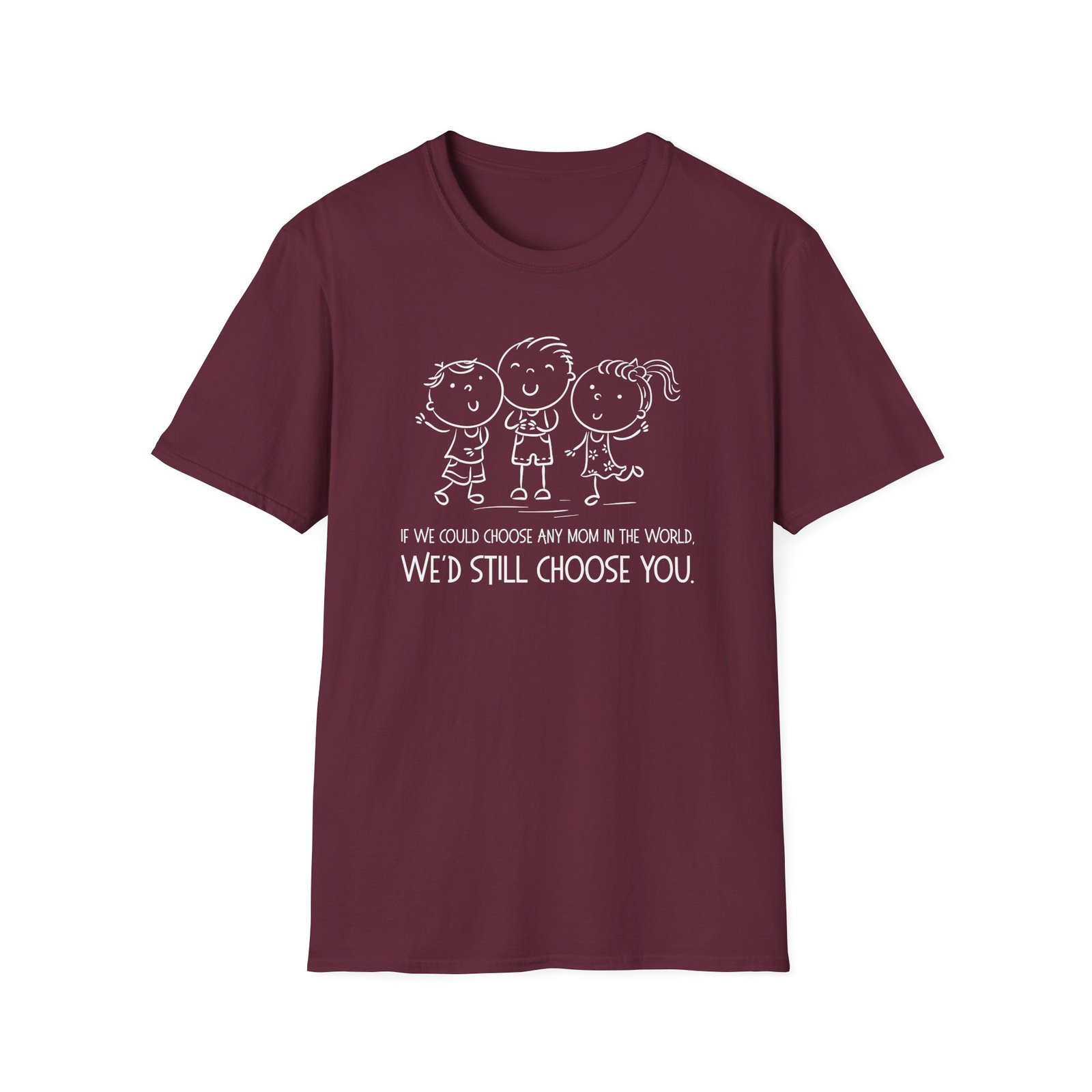 The We’d Still Choose You T-shirt features a heartwarming illustration of siblings standing together, paired with the touching message: “If we could choose any mom in the world, we’d still choose you.” The design captures the innocence and love of childhood, making it a sentimental piece that any mom would cherish. Made with soft, breathable fabric, the tee offers comfort and a relaxed fit perfect for everyday wear.